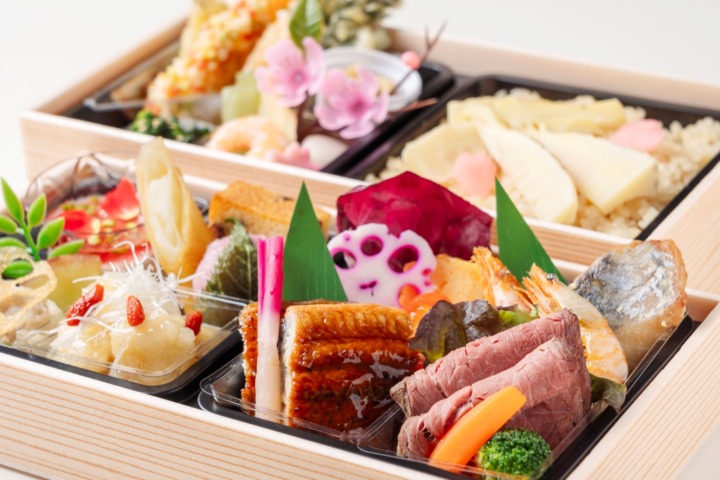 【壱の段】鰆の西京味噌焼き・小海老の唐揚げ・ローストビーフ・卵焼き・鰻蒲焼・桜餅・あずきのパウンドケーキ・チーズスティック・いかの白あんかけ・さくらのパンナコッタ・焼売・さつま芋檸檬煮